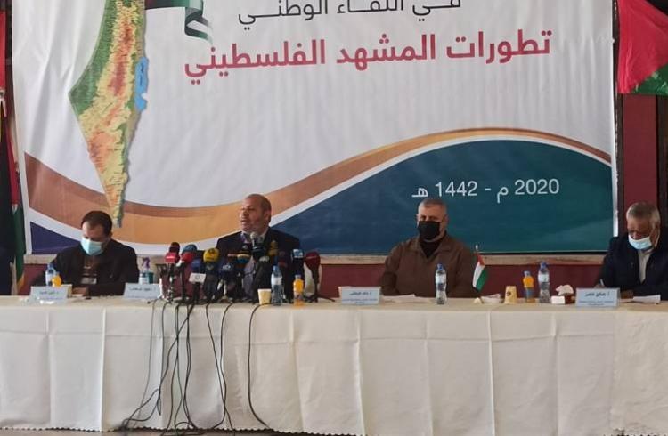 Khalil Al-Hayya, member in Hamas’ Political Bureau, said during the national meeting titled ‘Developments in the Palestinian Scene’ it was important to achieve national unity that is based on partnership to launch the biggest joint work against the Israeli occupation. He also described betting on the US administrations and negotiations as a doomed bet that hits the partnership project hard. Al-Hayya pointed to the fact that the PA is being lured to join normalization in the region and to reshuffle the cards to serve the interests of the USA and the occupation through resuming civil and security coordination with the occupation. He stressed that coordination strikes national partnership and work in the heart. However, the factions have not given up on reconciliation yet. Al-Hayya said it was imperative to hold the elections simultaneously (the National Council, the Legislative Council and the Presidential elections). This was Hamas’ proposition to Fatah in Cairo, which also pledged not to hinder the elections and to participate in what best fits.