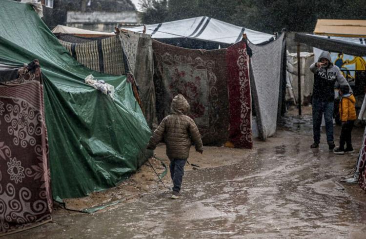 Dozens of tents sheltering displaced families in the Al-Mawasi area of Khan Younis, in southern Gaza, were flooded this morning after heavy rainfall.